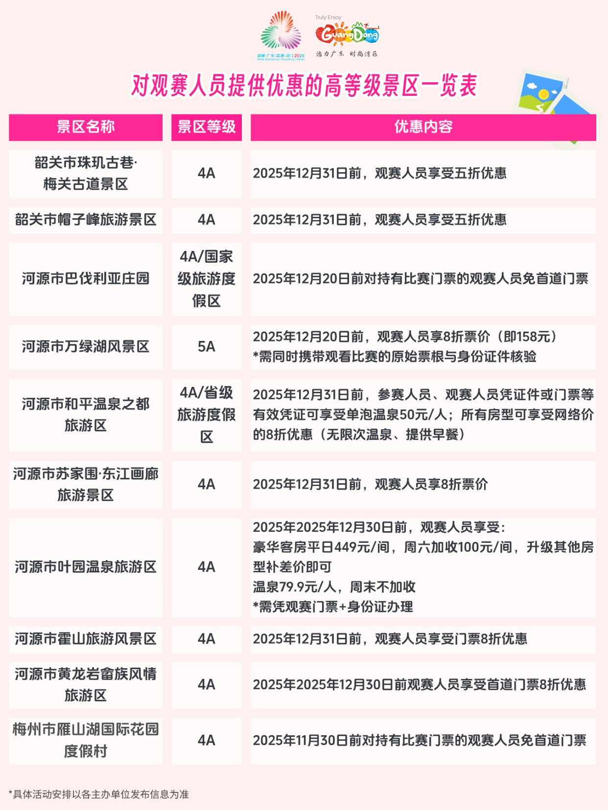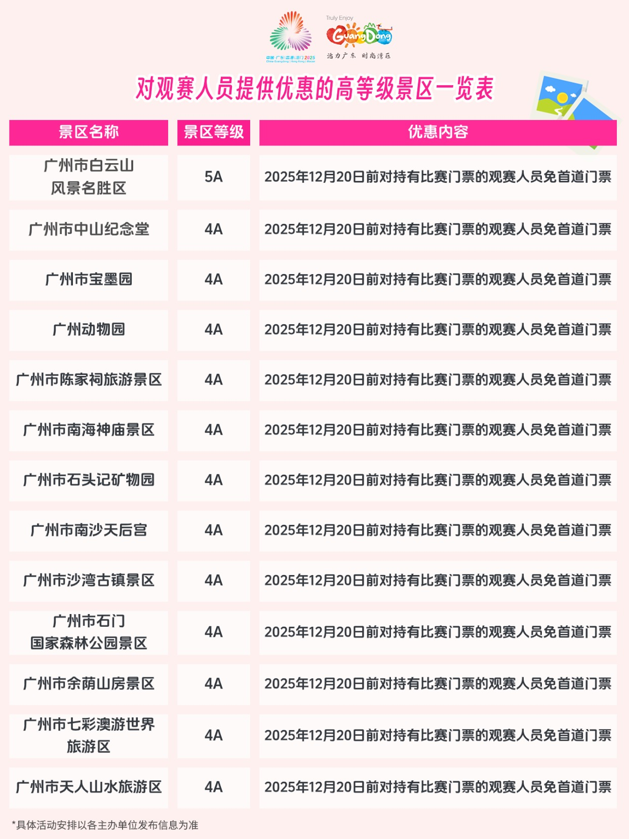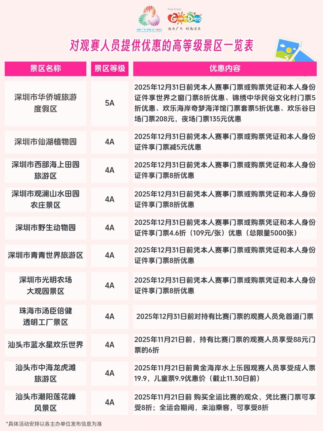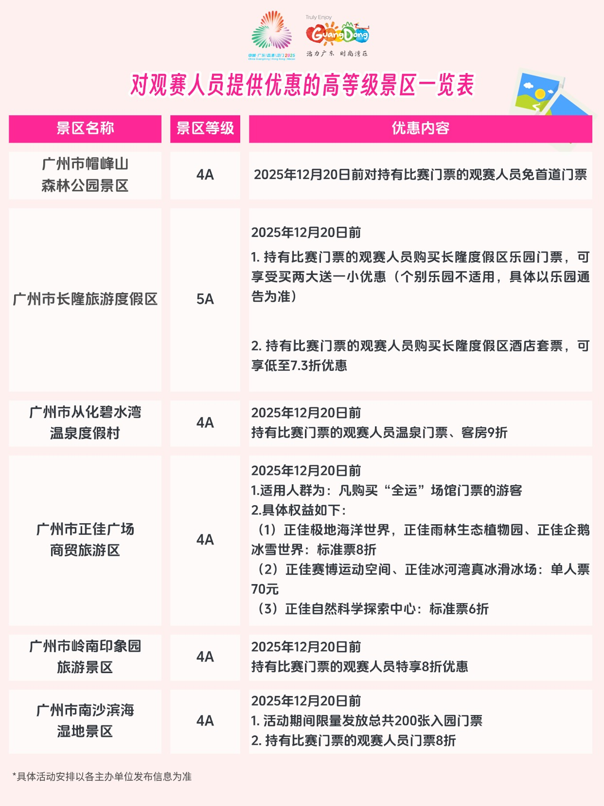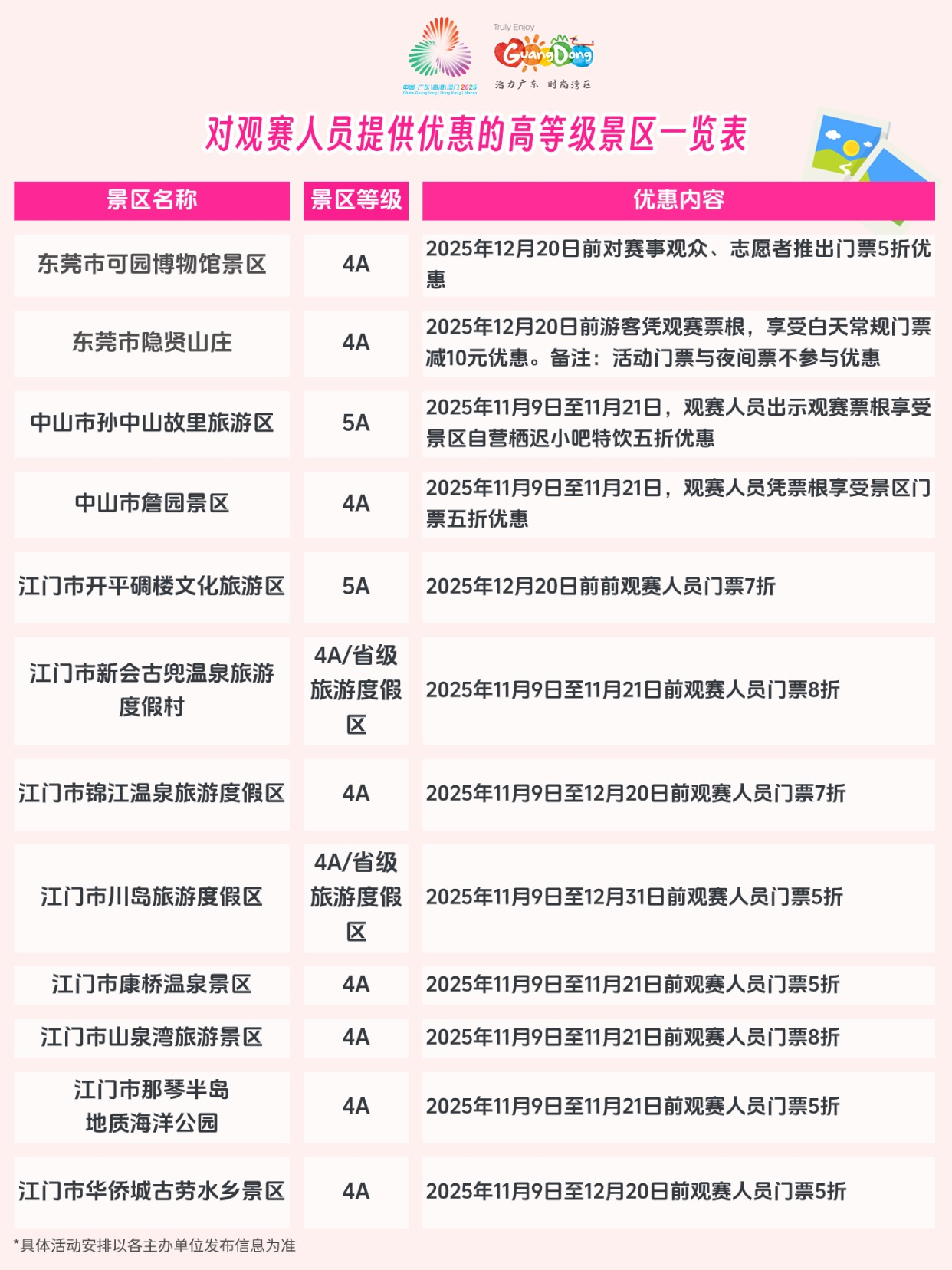 为营造“全民全运、共享盛事”的良好氛围,全省超过100家4A级以上旅游景区和省级以上旅游度假区同步面向观赛游客推出形式多样的游览优惠,包括门票折扣、联票套餐及特色体验活动,让广大观众在观赛之余,能够轻松畅游广东,深入感受岭南文化的独特魅力。活动期间,各地还将发布本地区优惠景区名单。我们诚挚邀请各地运动员与游客在这个冬天走进广东,在温暖气候与诚意礼遇中,共赴一场“看全运、游广东”的难忘旅程。
