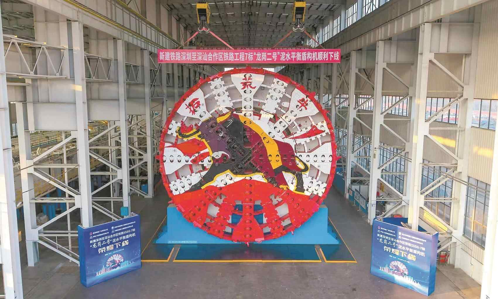 10月24日,刀盘涂装“拓荒牛”图案的超大直径盾构机在湖南长沙顺利下线,将应用于新建深圳至深汕特别合作区铁路(以下简称“深汕高铁”)龙岗隧道工程,标志着粤港澳大湾区在建时速350公里高铁新添隧道掘进利器。由中铁十四局和铁建重工集团联合研制的这台大国重器,具有完全自主知识产权,即将整装入列。