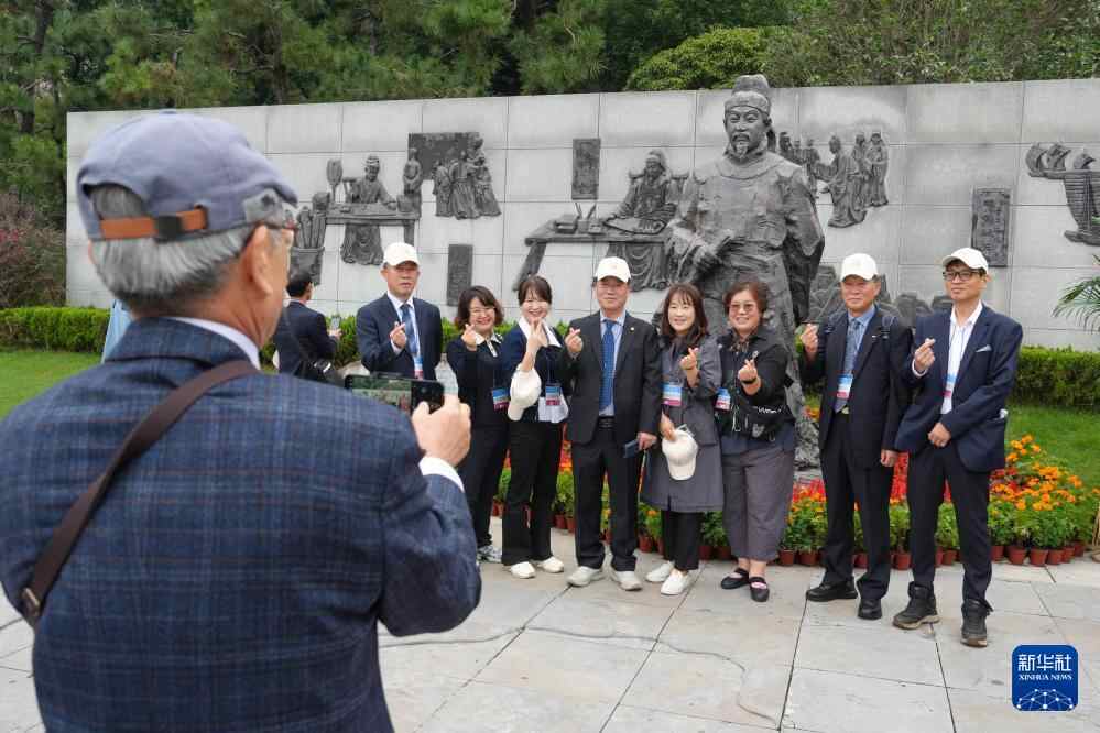 10月15日,韩国庆州崔氏中央宗亲会组织代表团来到江苏省扬州市的崔致远纪念馆举行祭享活动,代表团成员们在崔致远雕塑前合影留念。