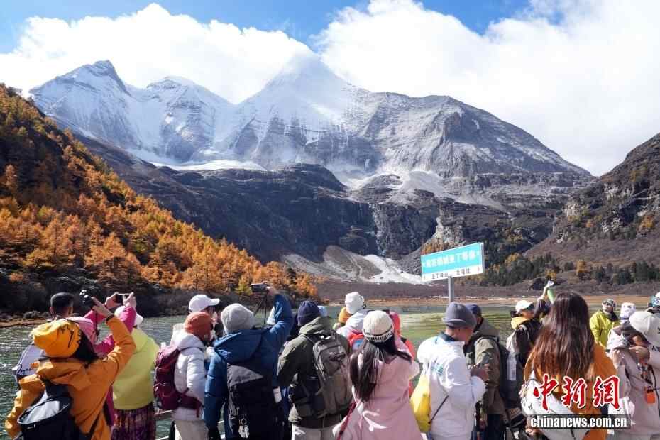 10月29日,在稻城亚丁风景区,游客在央迈勇峰前观光、拍照。稻城亚丁风景区位于四川省甘孜藏族自治州,属国家级自然保护区、四川省级风景名胜区和世界生物圈保护区。亚丁藏语意为“向阳之地”,央迈勇峰海拔6033米,被美国探险家洛克誉为“世界上最美的山峰”。今年10月1日至10月28日,景区接待游客约18.9万人,其中海外游客超1万人。