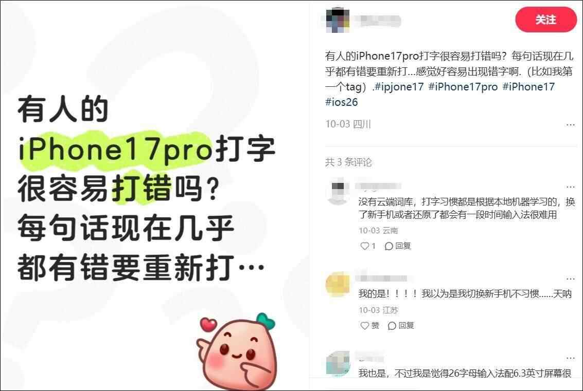 还有人在更新到iOS 26后抱怨输入问题,表示自己突然出现“愚蠢的打字错误”,并注意到空格键有时会失灵,整体感觉打字精度下降。另一位用户也提到,升级到iOS 26后,尤其是在输入长消息时,键盘感觉卡顿或迟钝。