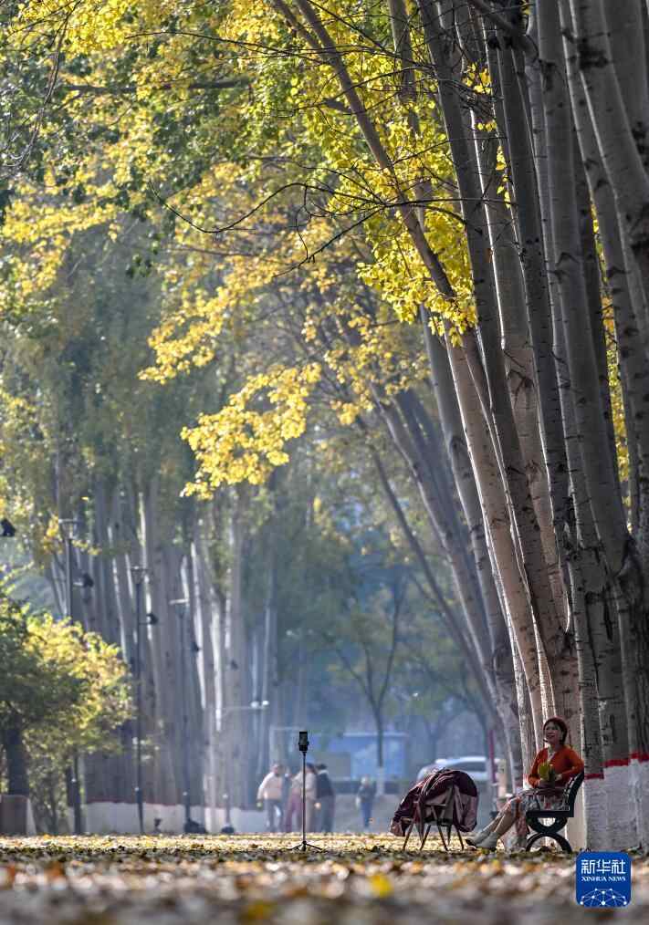 10月28日,市民在银川市凤凰公园赏景、留影。