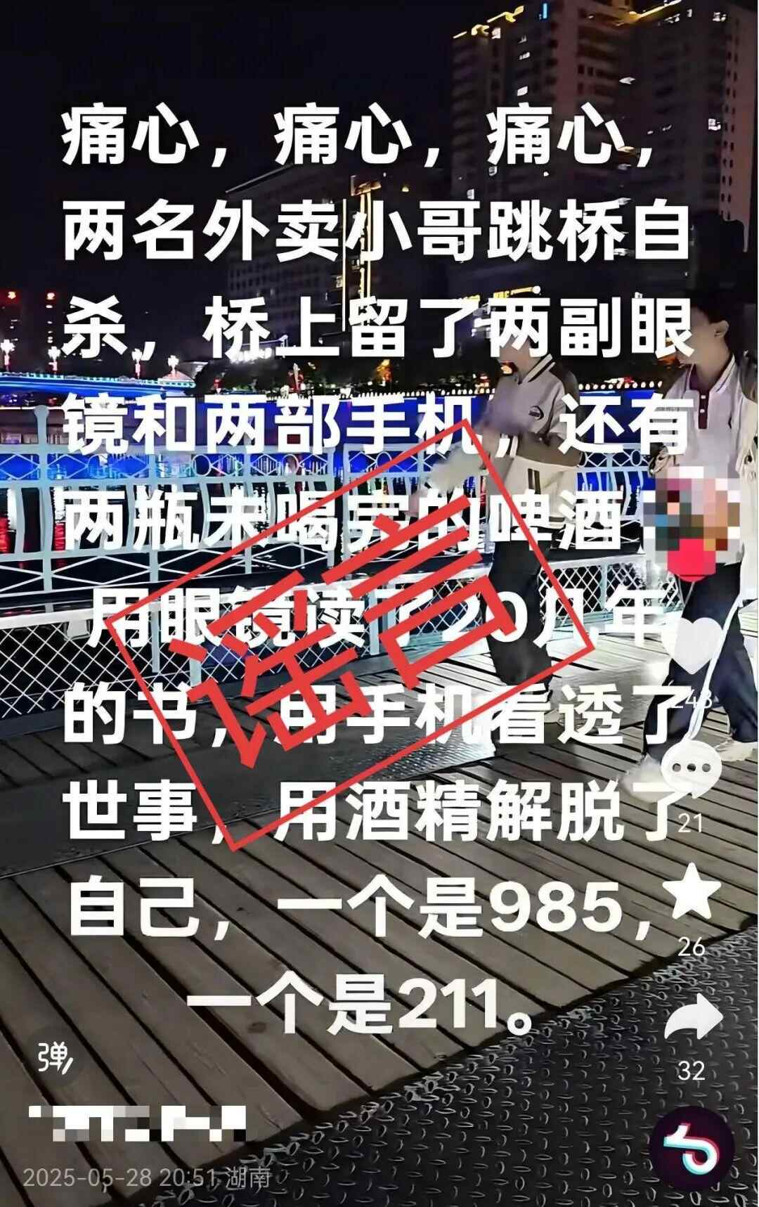 2025年5月29日,网民覃某在某短视频平台发布溆浦县浮桥视频,并配文称“痛心,痛心,痛心,两名外卖小哥跳桥自杀,一个是985,一个是211”的视频。经核实,溆浦县没有发生外卖员跳桥自杀的相关情况。覃某为博人眼球,吸引流量,编造外卖员在溆浦县浮桥跳桥自杀的谣言,后通过自媒体账号发布,造成不良社会影响。目前,公安机关已依法对覃某予以行政处罚,相关视频已被责令删除。
