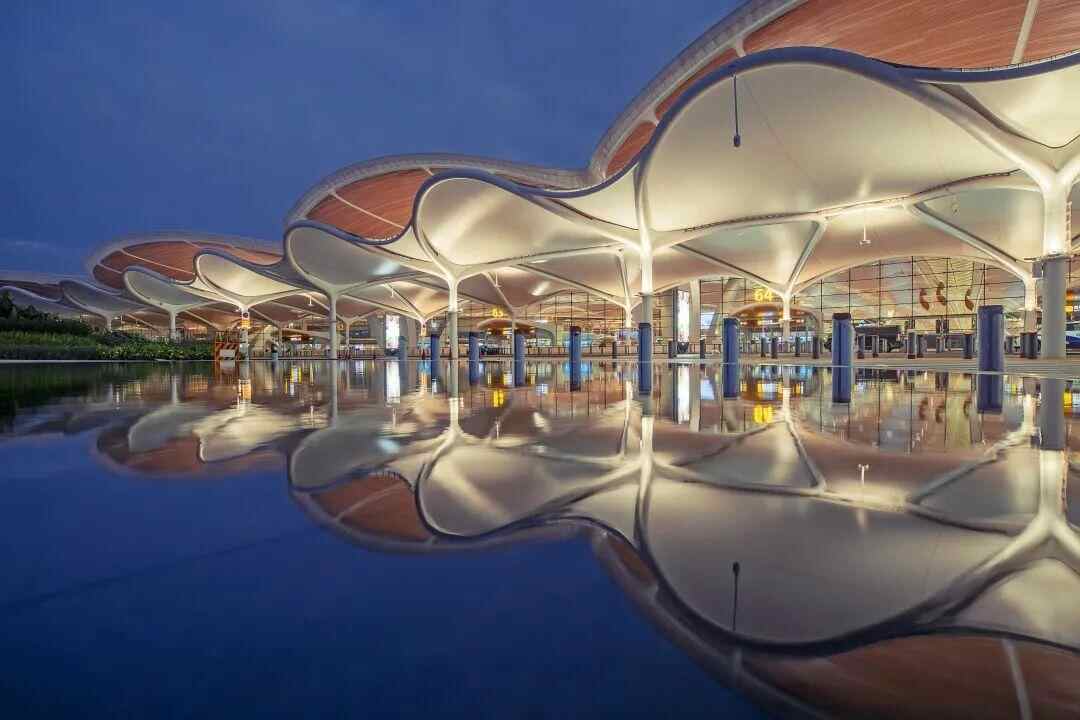 全国首个连续着色焊接不锈钢屋面航站楼,有效解决防水问题,提高抗风能力;
