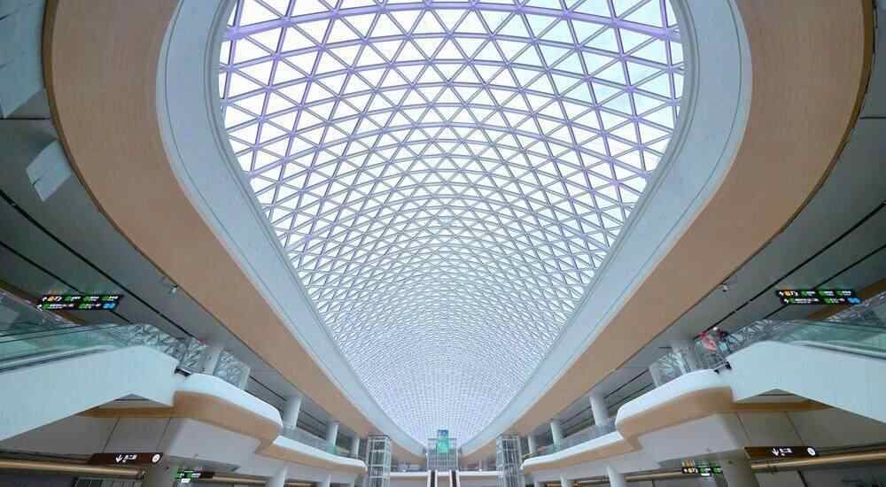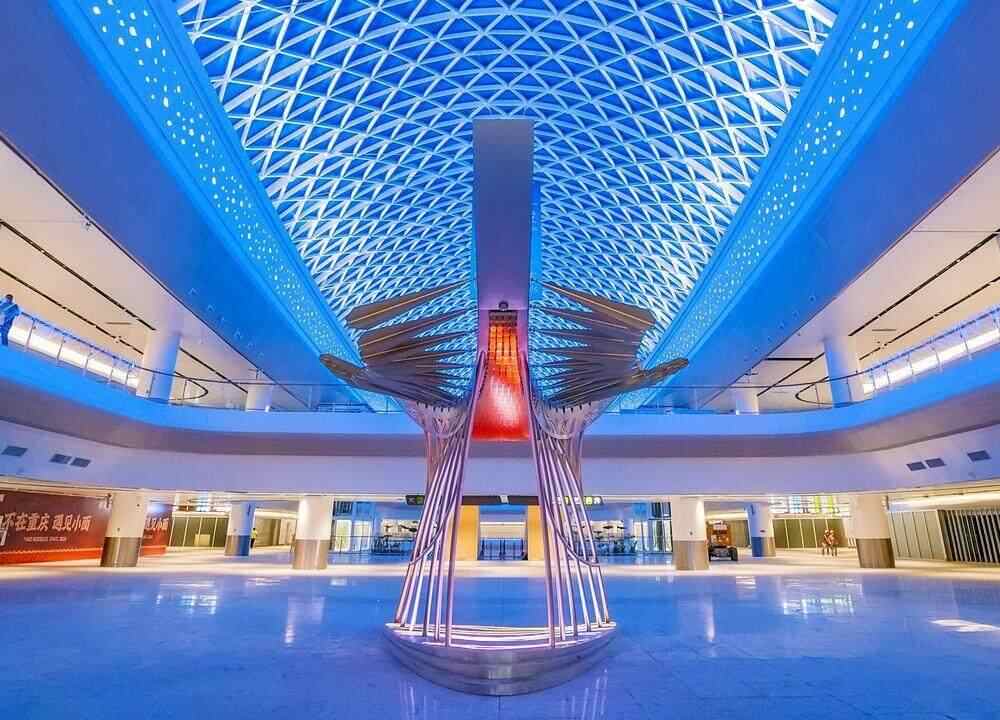 据中铁建工集团项目总工程师陈瑞旸介绍,工程最大亮点,是交通中心上方5000平方米的采光穹顶。穹顶以“木棉花开 九天银河”为设计理念,长约174米,最大跨度32米,为拱形网壳结构,由1222个圆毂和3878件方管杆件构成。