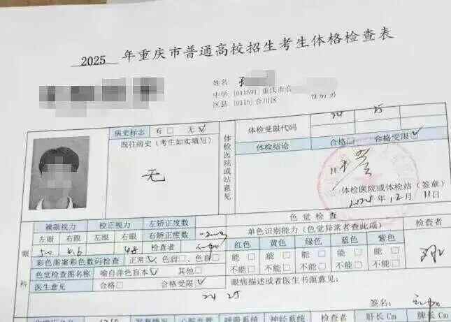 据封面新闻10月29日消息,目前合川教育考试院已介入调查。学校招生办工作人员表示,不确定是不是地方做高考体检的时候不规范,才造成了体检结果的不准确。“建议他再次参加高考时,选择一些色觉不受限的专业。”