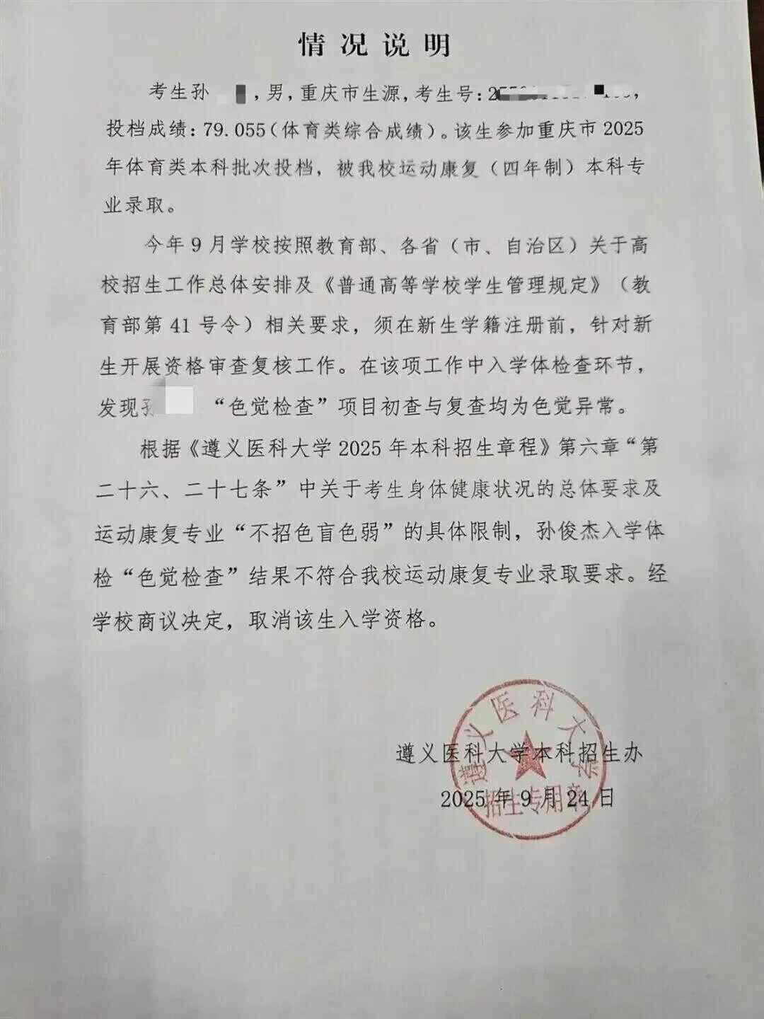 黄先生提供了一份由遵义医科大学出具的情况说明。说明上表示,根据《遵义医科大学2025年本科招生章程》,该校运动康复专业给出了“不招色盲色弱”的具体限制,孙某某入学体检“色觉检查”结果不符合该专业录取要求。经学校商议决定,取消该生入学资格。