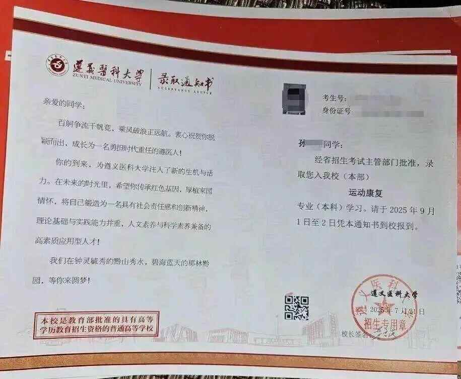 据涉事家长黄先生描述,儿子孙某某本是重庆合川中学2025届体育特长生。今年高考成绩502分,体育成绩87分,最终被贵州遵义医科大学运动康复专业录取。