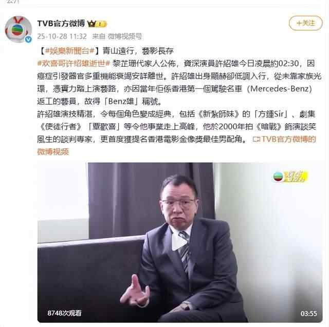 10月28日,@TVB官方微博 发文悼念许绍雄:青山远行,艺影长存。