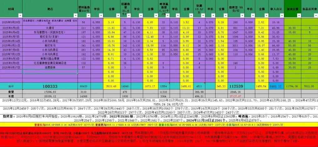 截至2025年10月25日,他共捡到塑料瓶71322个、铝罐15134个、啤酒瓶12777个、铁罐4749个,合计103982个饮料瓶;烧烤签116100根、其他垃圾3894.94斤;饮料瓶、烧烤签、其他垃圾,10年加起来共21600多斤。