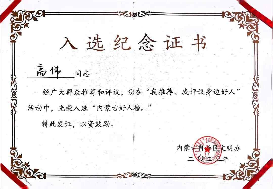 2023-2024年,高伟上榜“内蒙古好人”,荣获第十一届呼和浩特市道德模范称号,他的事迹先后登上新华网、光明网、正北方网、北疆新闻,被各大媒体广泛报道。四面八方的赞誉全向他涌来,但他却说:“荣誉属于所有环保志愿者。”