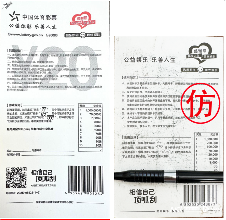该中心指出,正规的即开型体育彩票使用环保纸张和油墨,绿色、健康、易刮开;保安区和刮开区均有覆膜,票面印有防伪装饰纹,图案完整;而记者注意到,整蛊彩票的票面防伪纹路通常不完整、有截口,做工粗糙;且整体的长宽比例也与正规即开票存在肉眼可见的偏差。