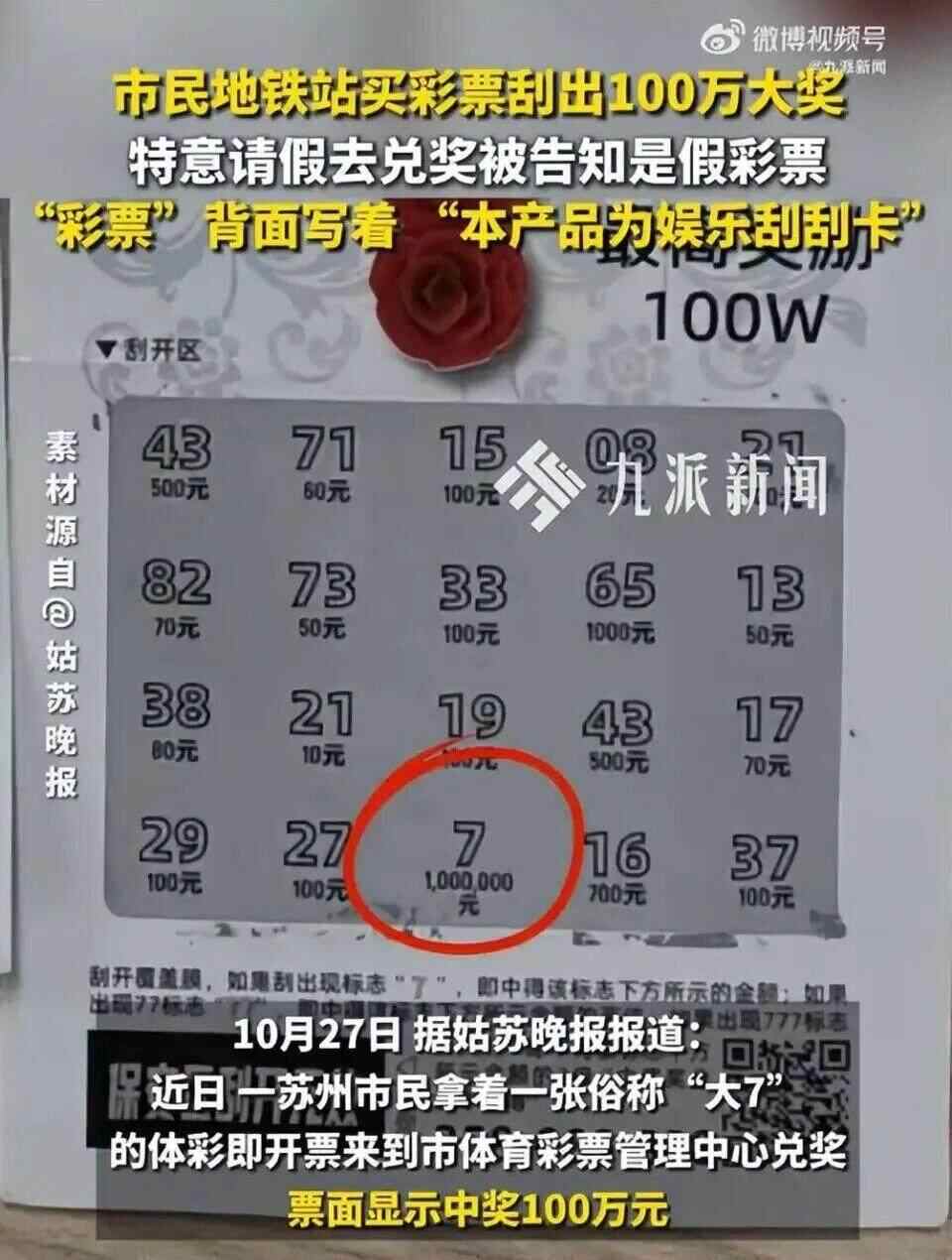 据了解,这位市民在一个地铁站的流动摊贩手上购买了两张“即开型彩票”,回去后刮出了“100万元”,特意查询了100万元的奖金可以在苏州市体育彩票管理中心兑换,专程请了假来兑奖。