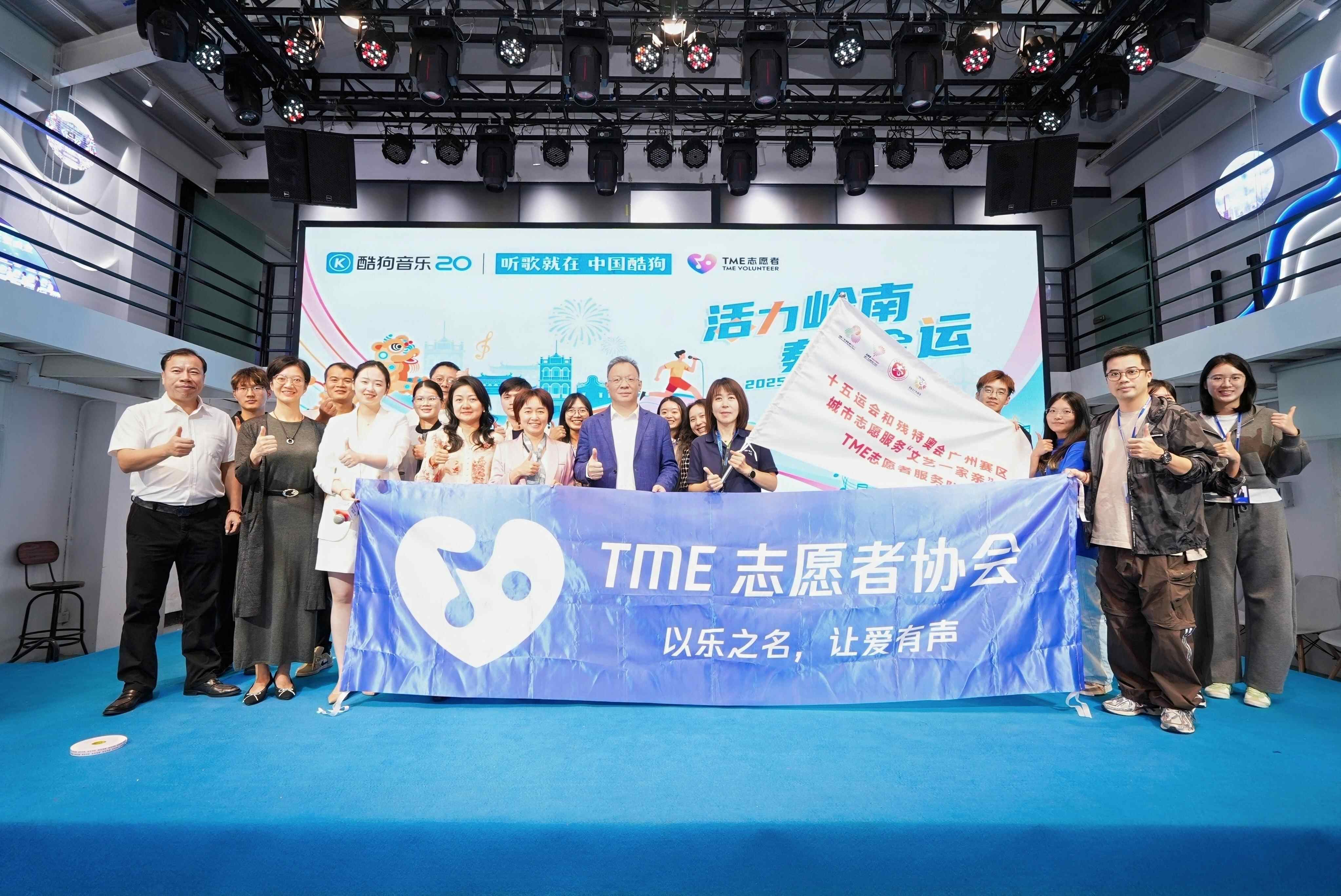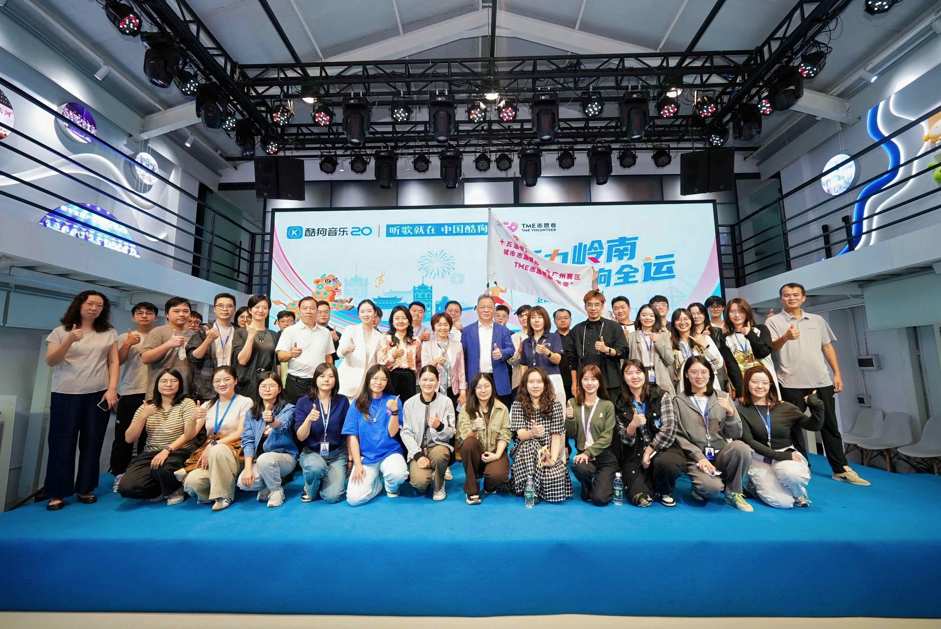 在与会嘉宾的共同见证下,十五运会和残特奥会广州赛区城市志愿服务“文艺一家亲”TME志愿者服务队授旗仪式举行,广州市文联党组成员、专职副主席皮健上台授旗,腾讯音乐娱乐集团内容运营高级总监、酷狗运营负责人李玲玲接过旗帜,承诺队伍将以“音乐+科技”为特色,深度融合岭南文化,打造 AI 合唱、数字音乐市集等特色项目,以多元创新方式致敬体育精神,为十五运会注入艺术活力。