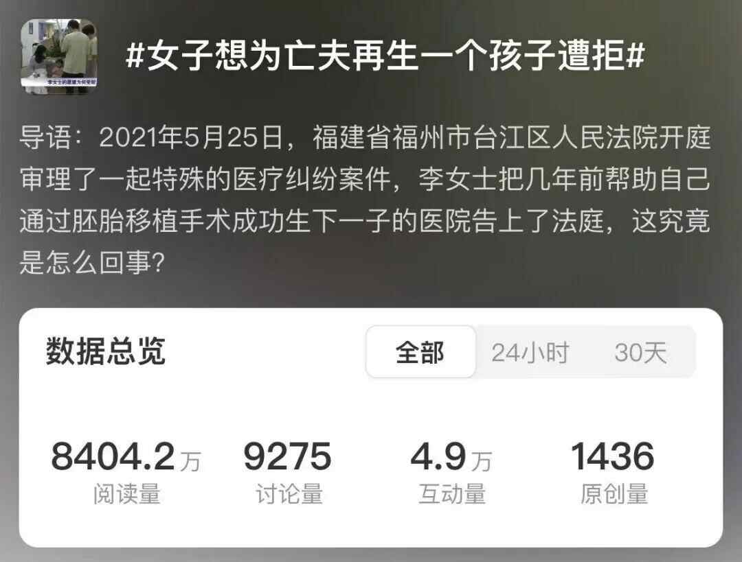 2020年9月,李女士的丈夫因头疼到医院就医,随后情况急转直下,40个小时左右被宣告死亡。此后李女士找到之前做胚胎移植手术的医院,希望医院能够再次帮助她实施手术,将仍在医院保存的剩余两个胚胎植入她体中。然而李女士没有想到,自己的诉求遭到医院的拒绝......