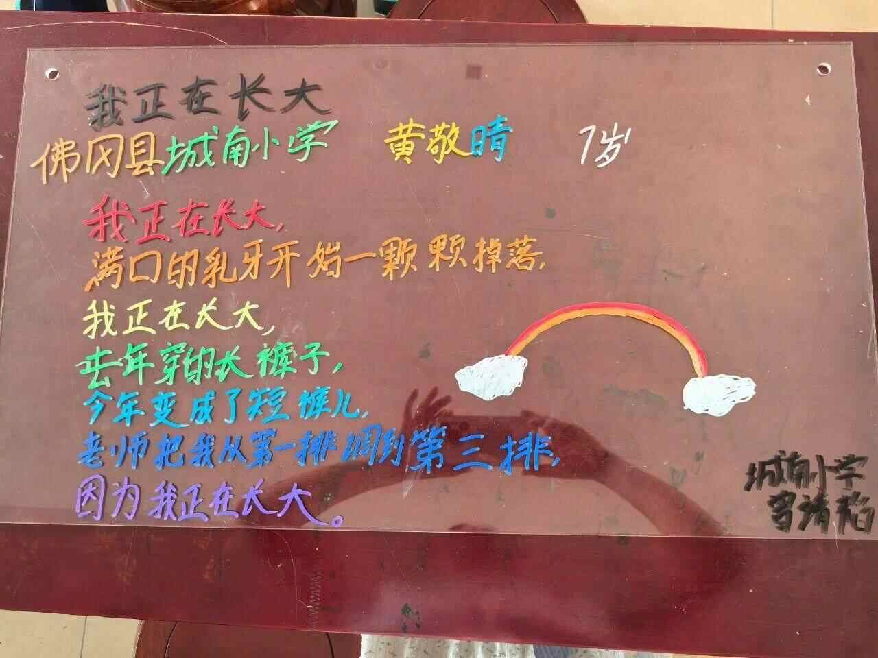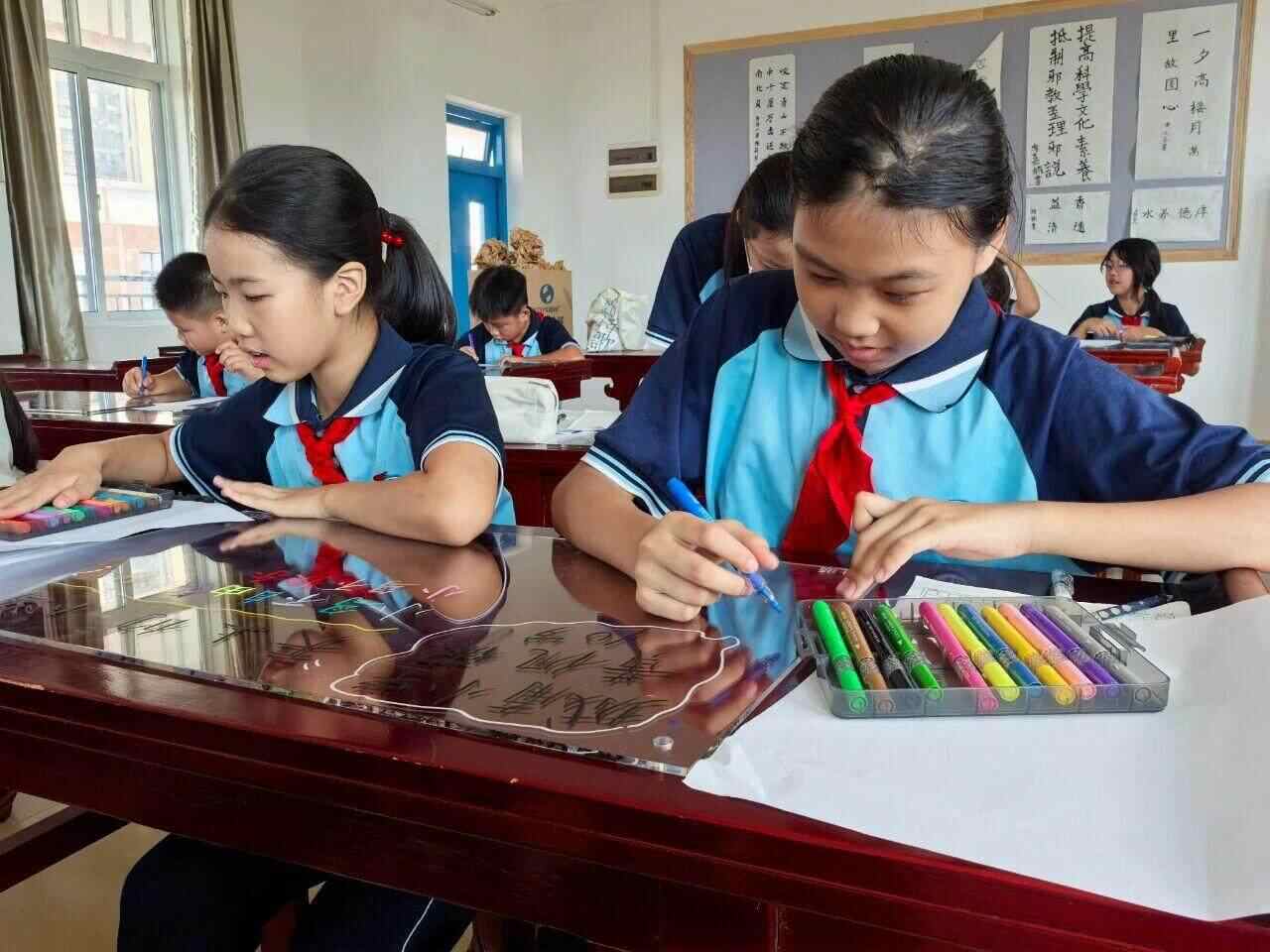 诗歌教室里,小王老师带来了一场别开生面的创意课程。同学们以“佛冈孩子的诗”为创作素材,在透明的亚克力板上进行诗画创作。他们将诗句与图画巧妙融合,用色彩和线条表达自己的想法和情感,现场充满了诗意与创意。