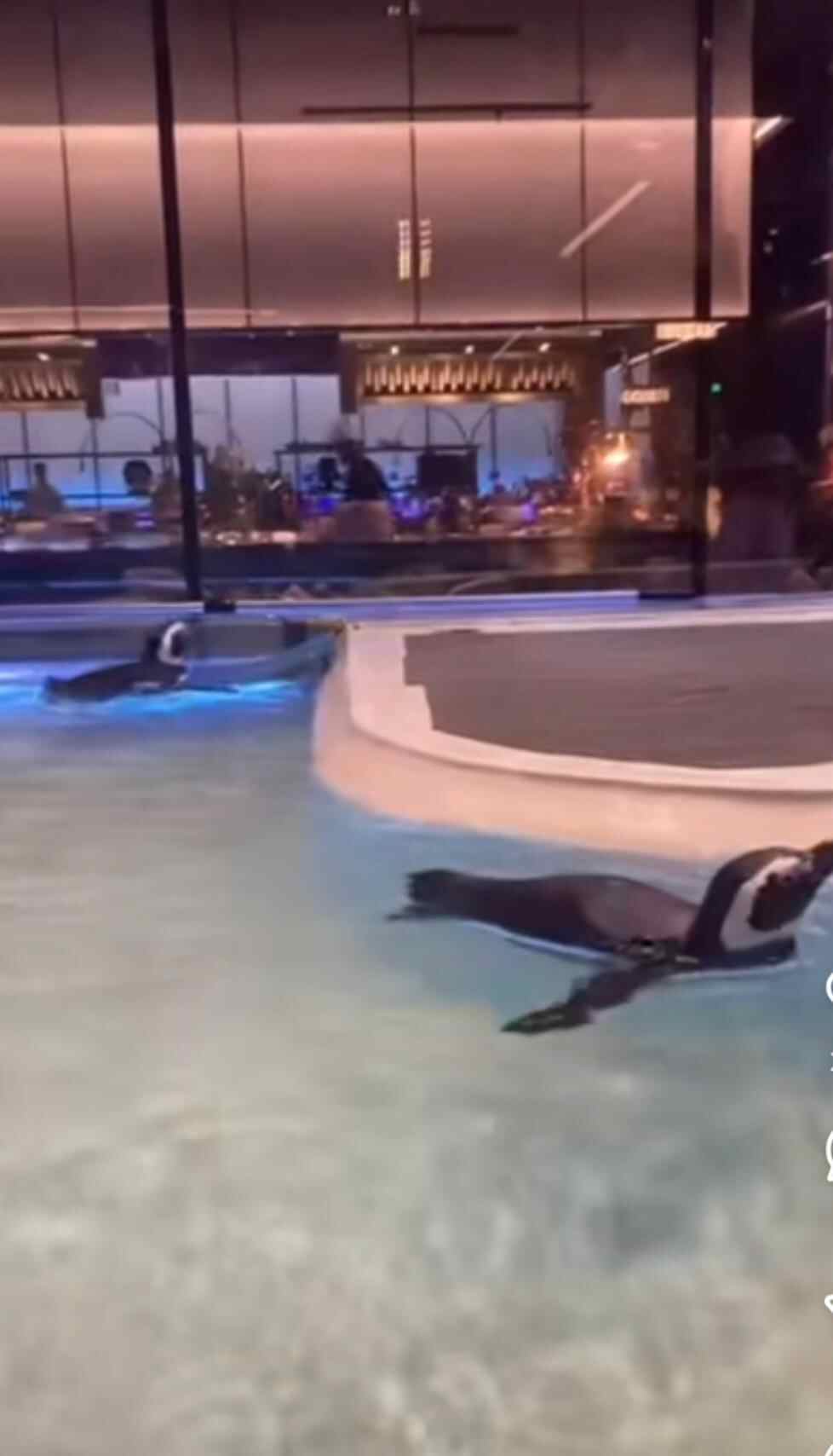 据网友发布的视频显示,两只企鹅在沈阳“喜鹊水汇”的一处水池内游泳,四周有玻璃隔离,玻璃外为游客自助餐用餐区。“喜鹊水汇”工作人员称,该洗浴中心内养殖了四只企鹅做观赏用,企鹅活动区与顾客活动区隔离,且有专人饲养。