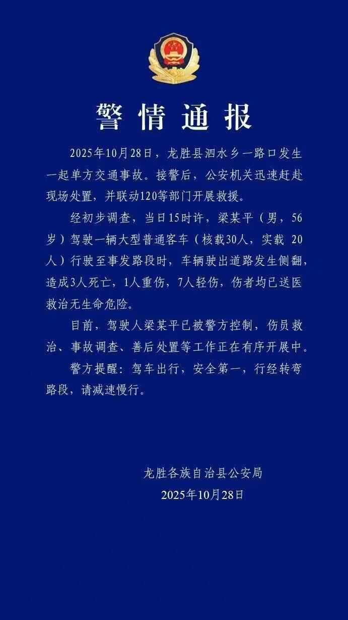 经初步调查,当日15时许,梁某平(男,56岁)驾驶一辆大型普通客车(核载30人,实载20人)行驶至事发路段时,车辆驶出道路发生侧翻,造成3人死亡,1人重伤,7人轻伤,伤者均已送医救治无生命危险。