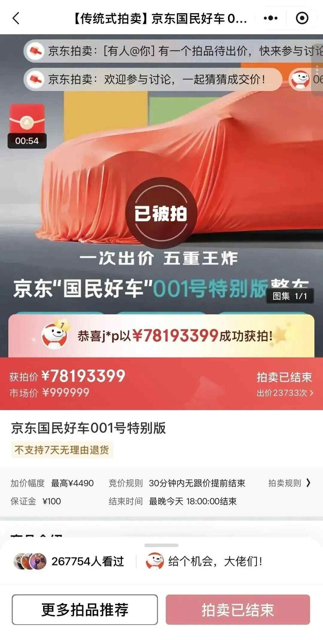 10月17日,京东“国民好车”001号上线京东App,并在“京东拍卖”频道开启预订。10月22日,京东App显示,京东001号“国民好车”拍卖已结束,该活动出价超23000次,最后获拍价达78193399元。