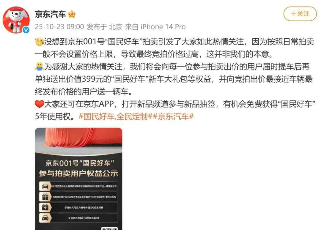 10月23日,京东汽车官方发布消息,称最终竞拍价格过高,并非本意,同时表示:为感谢大家的热情关注,将会向每一位参与拍卖出价的用户届时提车后再单独送出价值399元的“国民好车”新车大礼包等权益,并向竞拍出价最接近车辆最终发布价格的用户送一辆车。