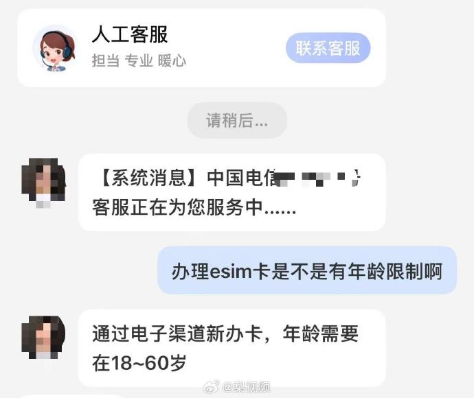 中国电信客服也确认存在该规定,并表示:“目前eSIM业务仍处于试运营阶段,因此设有相关年龄限制,后续可能会根据实际情况进行调整。”