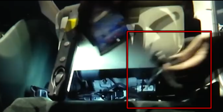 工作人员把主驾的座椅给拆了几颗螺丝,把主驾给抬起来了,然后从主驾座椅下方的一个孔里,工作人员用手拉出来了一个不知名的零件。