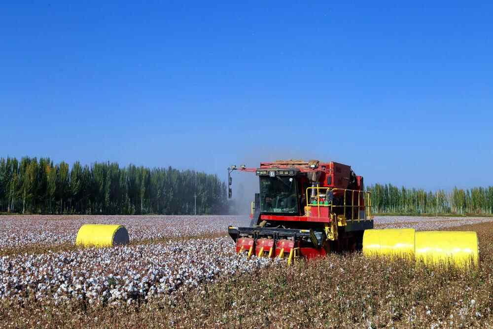 ↑2025年10月11日,在新疆阿克苏地区阿瓦提县拜什艾日克镇仓村,农民在驾驶采棉机采收棉花。CICPHOTO/包良廷 摄