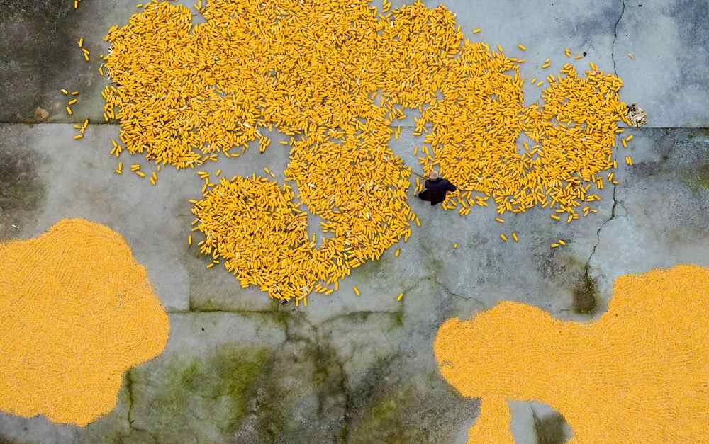 ↑2025年10月23日,农民在江苏省连云港市海州区一处农场翻晒玉米。(无人机照片)CICPHOTO/耿玉和 摄