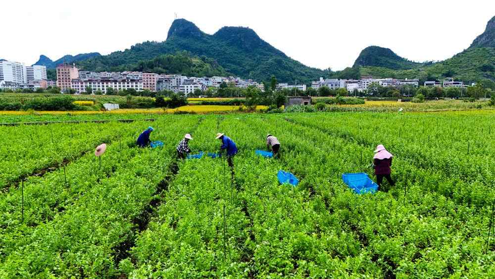 ↑2025年10月22日,农民在广西来宾市忻城县城关镇都乐村一处种植基地采收蔬菜。(无人机照片)CICPHOTO/樊绍光 摄
