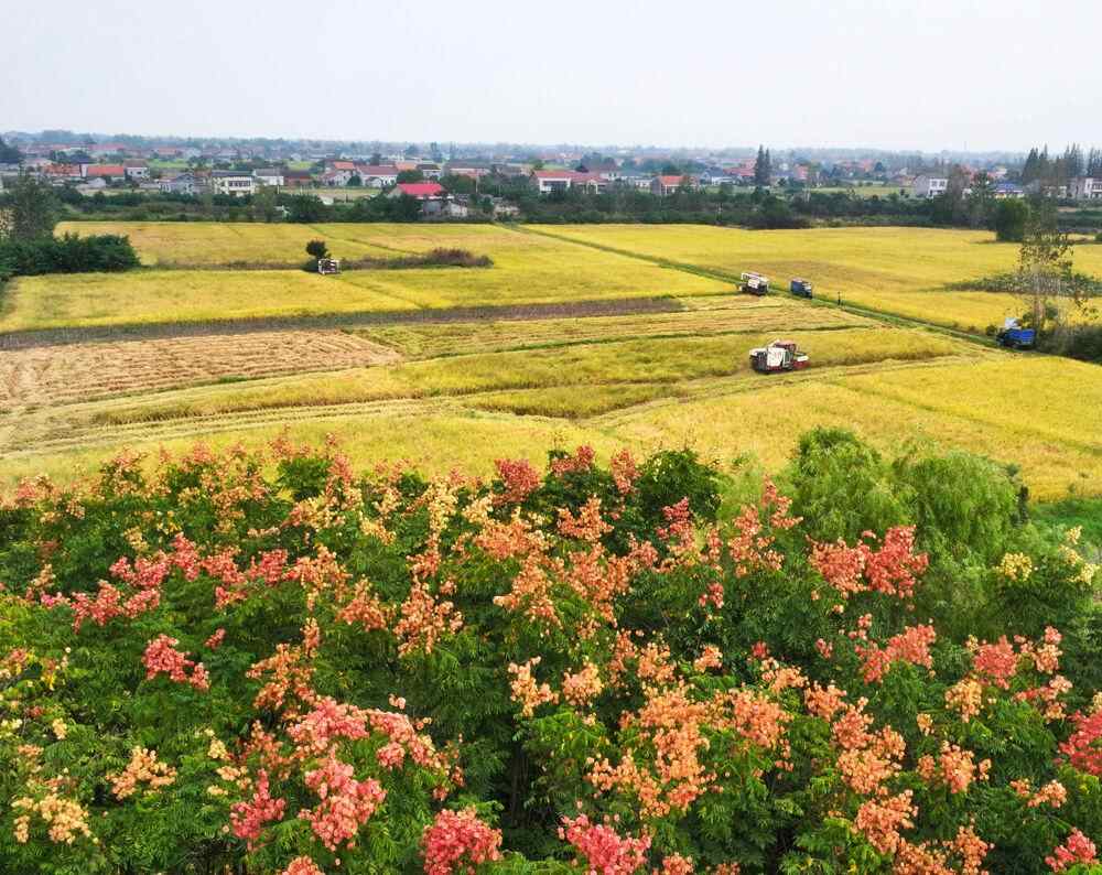 ↑2025年10月14日,农机手驾驶农机在湖南省常德市澧县大堰垱镇星星村收割晚稻。(无人机照片)CICPHOTO/柏依朴 摄