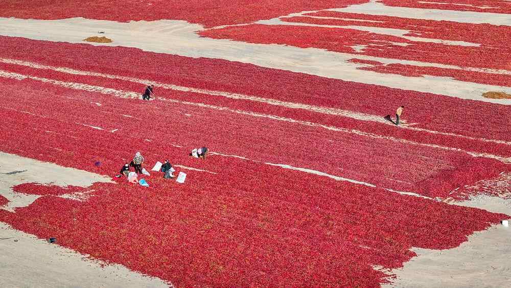 ↑2025年10月14日,农民在新疆阿克苏地区温宿县依希来木其乡晾晒辣椒。(无人机照片)CICPHOTO/鲍赣生 摄