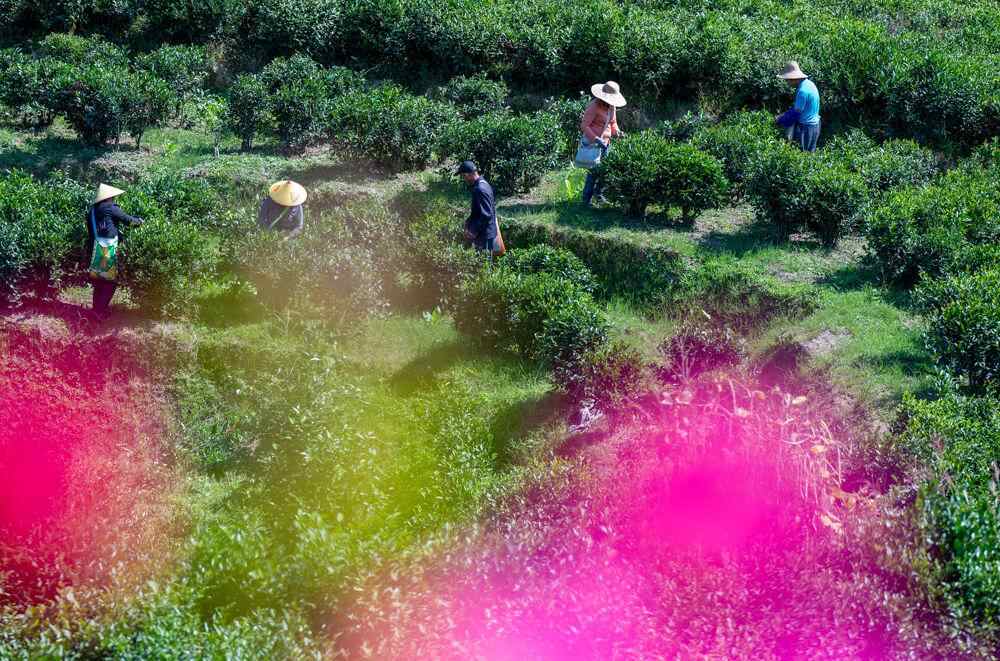 ↑ 2025年10月21日,茶农在广西梧州市苍梧县六堡镇黑石村一处茶园采摘秋茶。CICPHOTO/何华文 摄