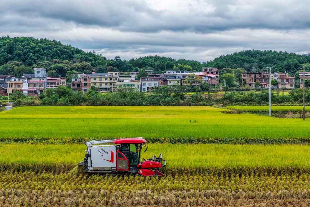 ↑2025年10月20日,农机手驾驶农机在湖南省永州市道县梅花镇宜阳村抢收晚稻。(无人机照片)CICPHOTO/蒋克青 摄