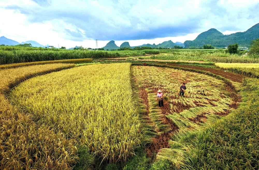 ↑2025年10月15日,农民在广西来宾市忻城县城关镇泮水村抢收稻谷。(无人机照片)CICPHOTO/樊绍光 摄
