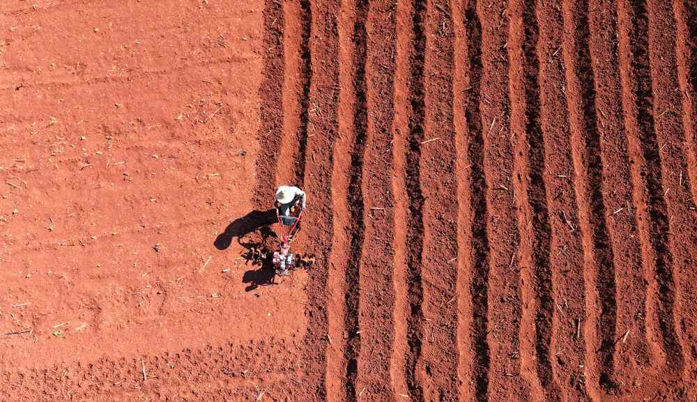 ↑2025年10月16日,农民在云南省弥勒市巡检司镇龙树村种植豌豆。(无人机照片)CICPHOTO/普佳勇 摄