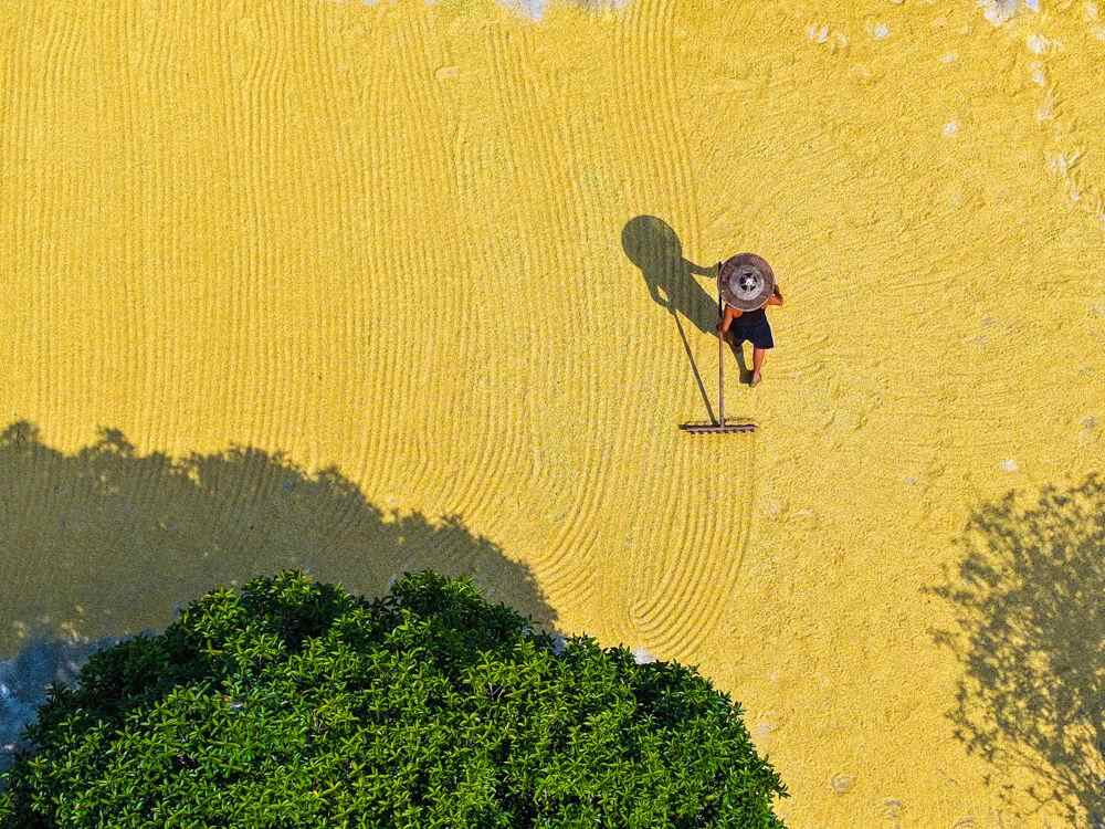 ↑2025年10月11日,农民在湖南省常宁市兰江乡晾晒稻谷。(无人机照片)CICPHOTO/周秀鱼春 摄