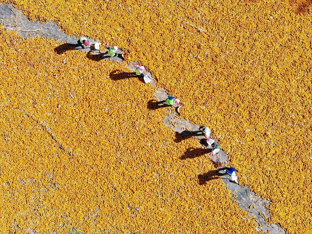 ↑2025年10月12日,农民在甘肃省张掖市甘州区一处晾晒场上晾晒玉米。(无人机照片)CICPHOTO/吴学珍 摄
