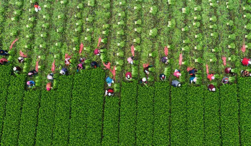 ↑2025年10月19日,农民在山东省东营市广饶县乐安街道榆林村收割芹菜。(无人机照片)CICPHOTO/刘云杰 摄