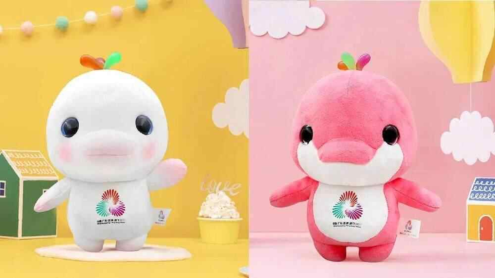店内陈列的特许商品种类丰富,覆盖吉祥物毛绒玩具、纪念徽章、金属冰箱贴等多个品类。吉祥物“喜洋洋”和“乐融融”以国家一级保护动物中华白海豚为原型设计,传递出自然界与人类社会的互助精神,也寓意粤港澳三地同心协力、共创未来的美好愿景。
