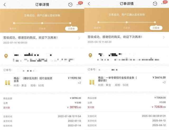 从2020年起,他就每年从年终奖中拿一部分购买某银行的投资金条。“工资的开户行就在这所银行,在手机上就可以直接操作,非常方便。”余教授拿出手机,点开银行App,就可以很方便地进行购买。以2022年的一次购买经历为例,他当时花了38785元购买了规格为50克的金条两根,每克单价为387元。最近的一次购买价经历则在今年4月8日,这次还是两根50克的金条,总价则为72828元,每克单价为728元。