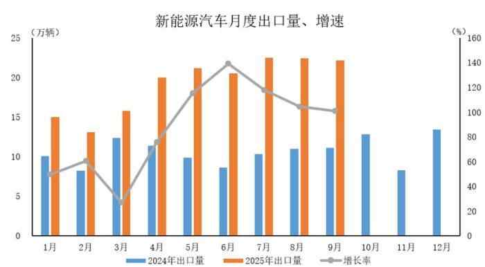 2025年9月,新能源汽车出口22.2万辆,环比下降0.9%,同比增长1倍。