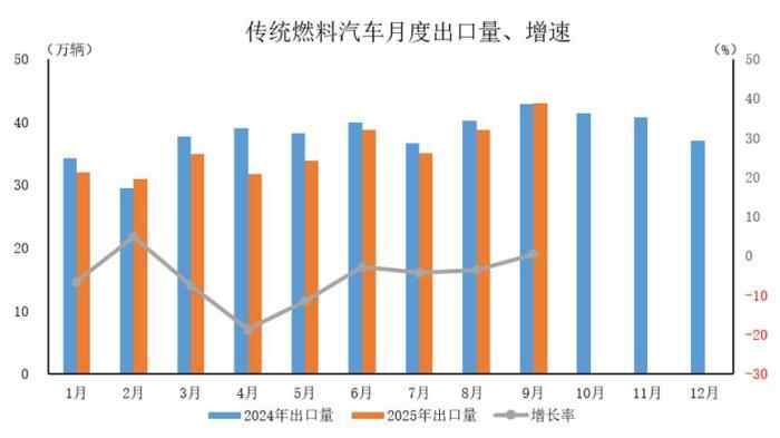 2025年9月,传统燃料汽车出口43万辆,环比增长11.1%,同比增长0.5%。