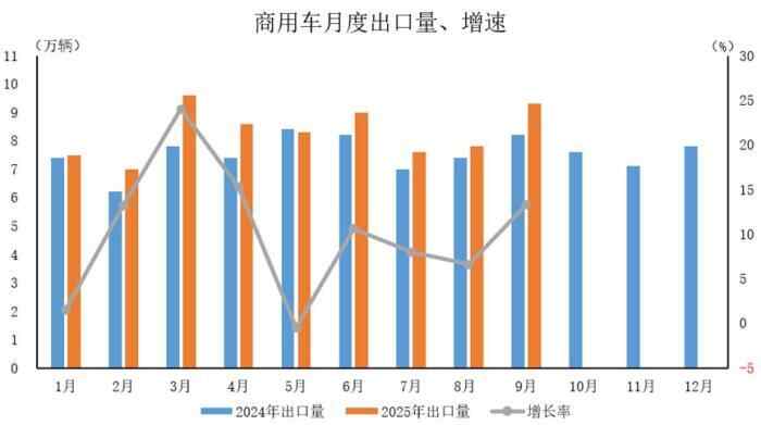 2025年9月,商用车出口9.3万辆,环比增长18%,同比增长13.3%。