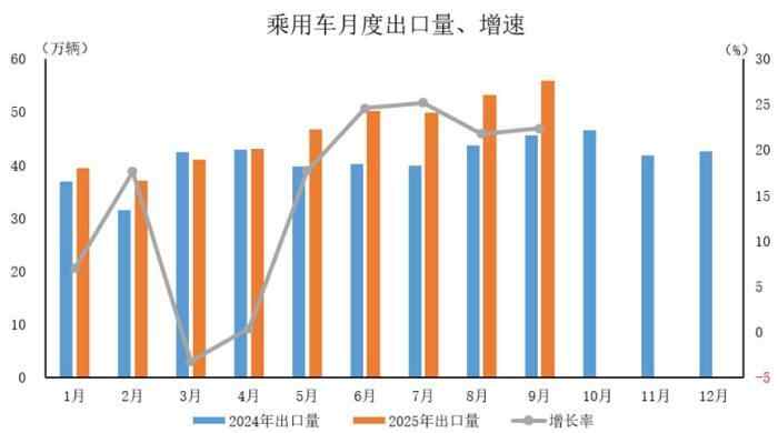 2025年9月,乘用车出口56万辆,环比增长5%,同比增长22.4%。