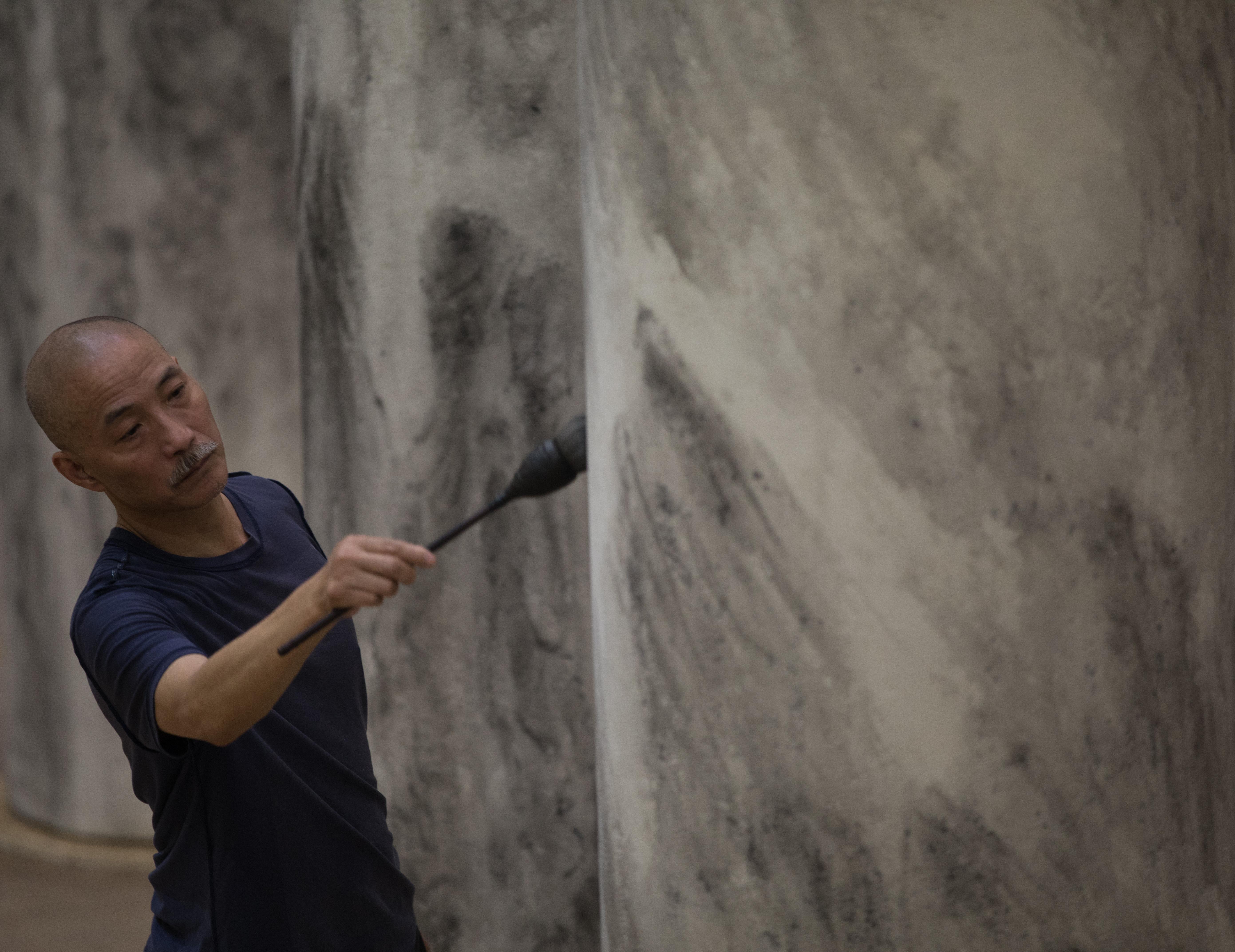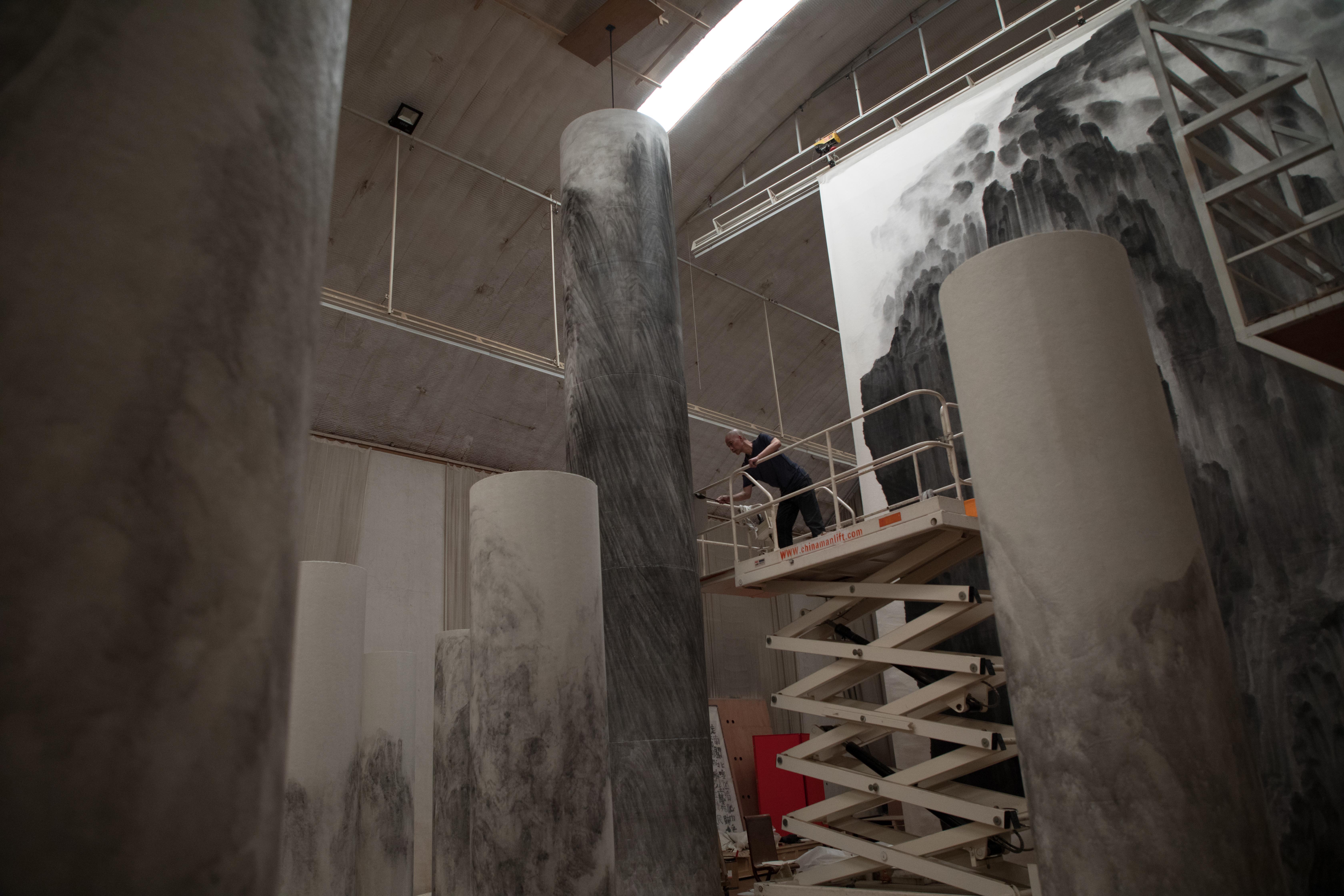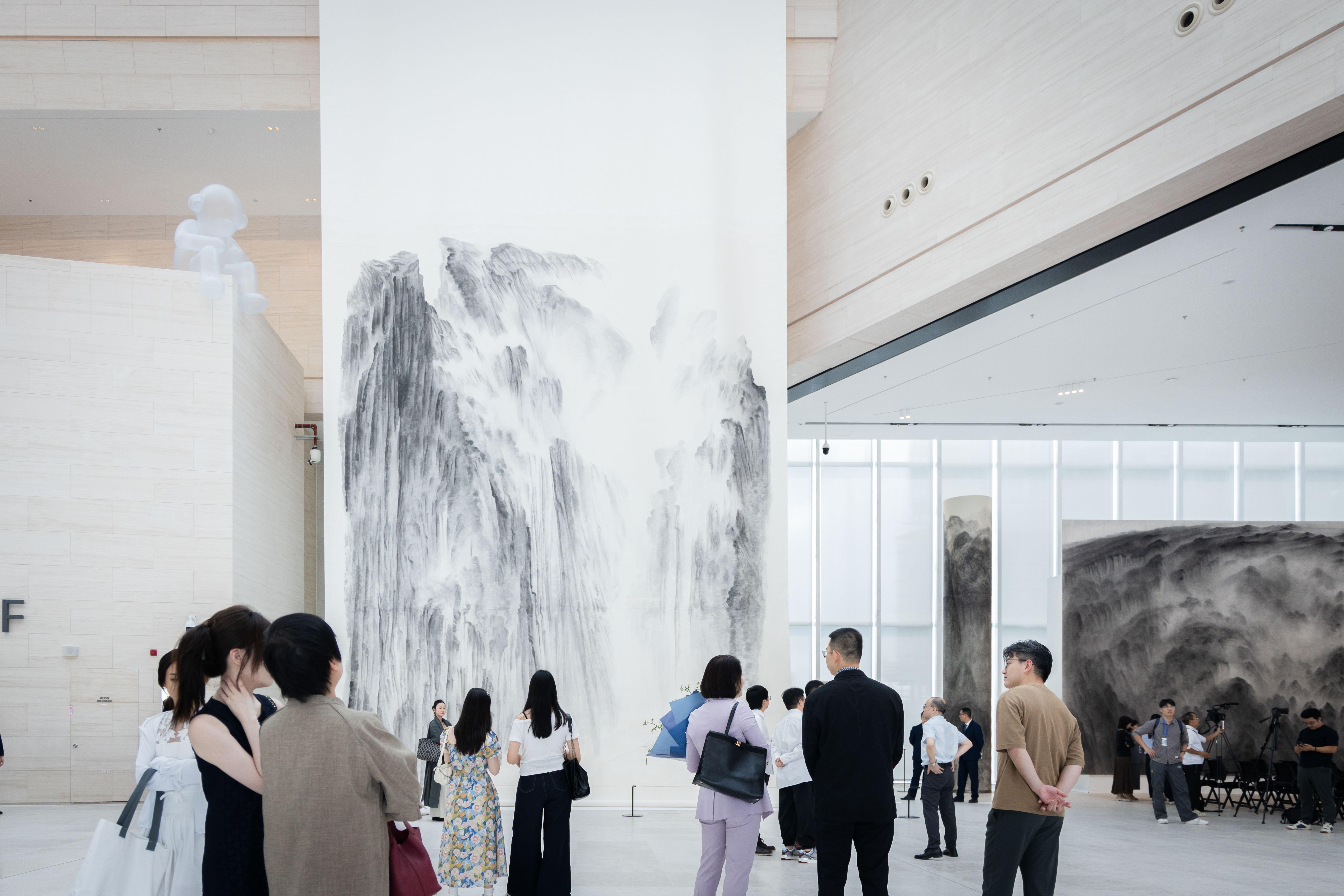 “江山万象——徐龙森山水作品展”集中呈现了徐龙森数十件大型水墨作品及装置。高达10米多的巨幅水墨《山不厌高》从高空“倾泻”而下,《天元》《大丘壑》《三棵树》等多幅代表作同场亮相,让观众领略摄人心魄的水墨力量。