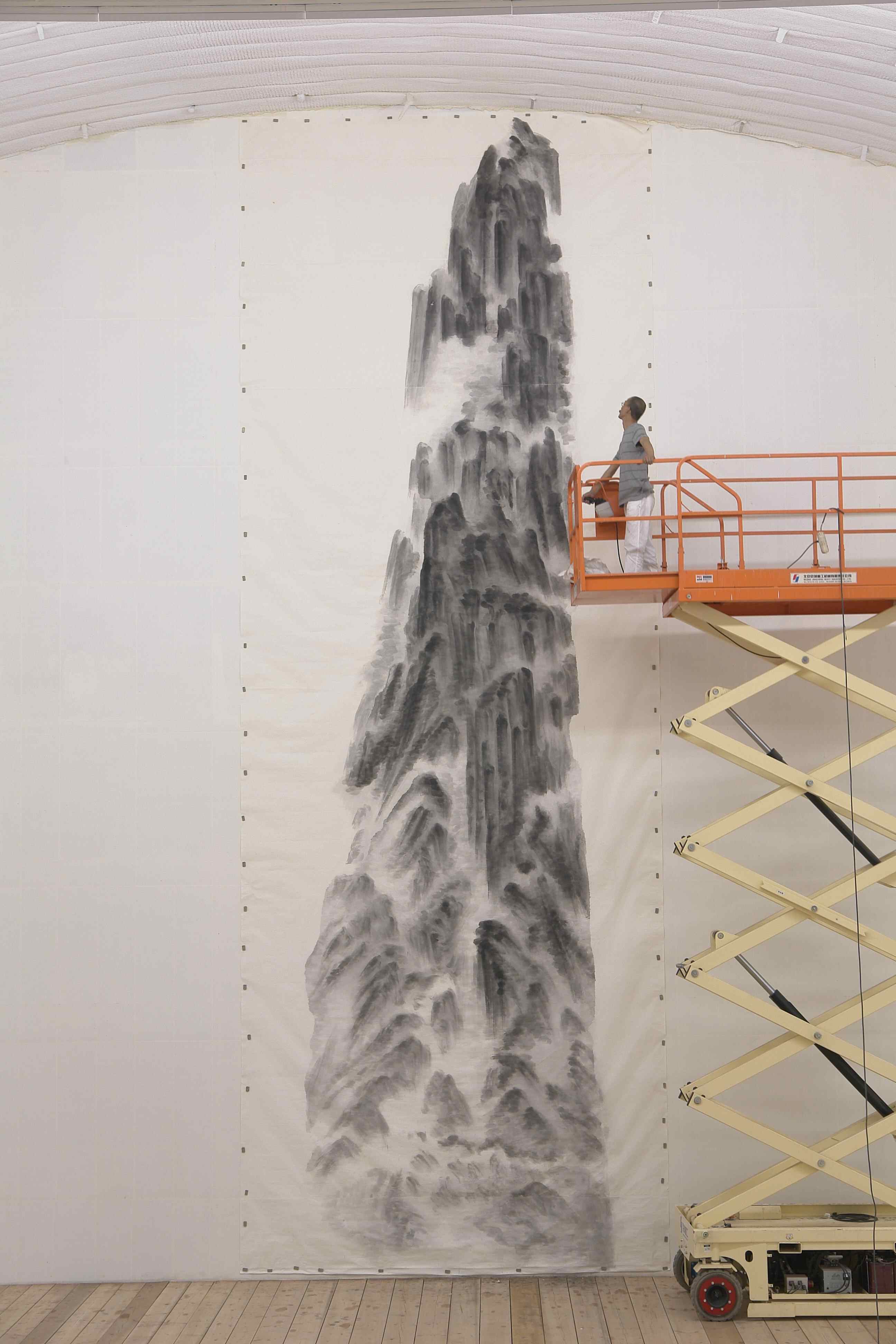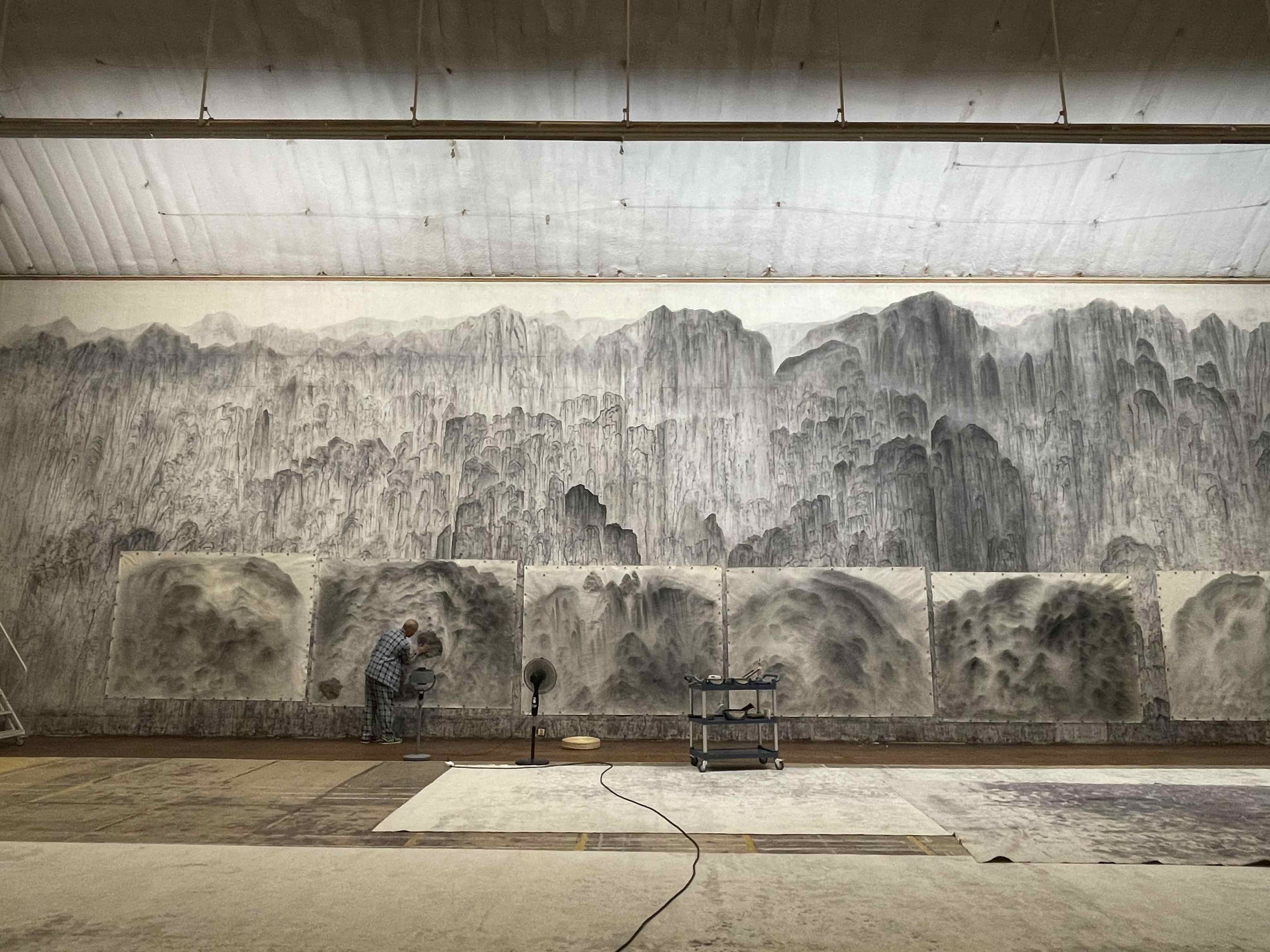 追根溯源,徐龙森走上巨幅山水创作之路,与一段艺术史的讨论密不可分。“20世纪60年代,艺术界就有过‘如何把山水画画大’的探讨。与油画、雕塑在美术馆等公共空间展示的效果相比,传统山水画因体量小而显得张力不足。”他表示,多位前辈艺术家曾尝试放大山水画,希望让其与油画“等量齐观”。“他们的探索给了我启发,也让我意识到,要让山水画在公共空间有分量,必须从创作方式上寻求突破。”