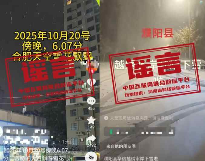 真相:近期,多地迎来降温,网络上陆续出现“2025年10月20日傍晚合肥天空雪花飘飘”“安徽淮南下雪了”“河南濮阳下雪”等内容的视频,引发关注。经河南濮阳,安徽合肥、淮南等地气象部门核实,近期未监测到降雪情况,上述信息系谣言。(来源:河南省网络辟谣平台、@大皖新闻)