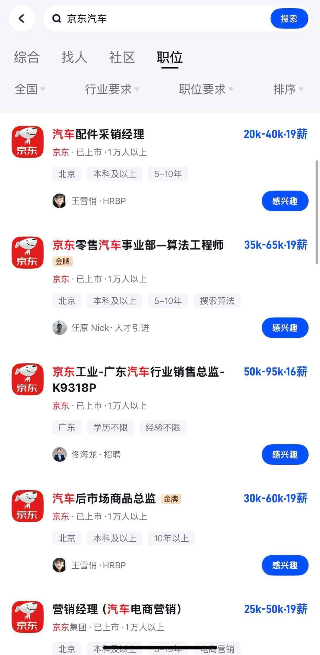 近期,记者在招聘平台脉脉上看到,京东发布的汽车岗位招聘,包括采销经理、算法工程师、销售总监等,对应京东零售汽车事业部和京东工业等业务。