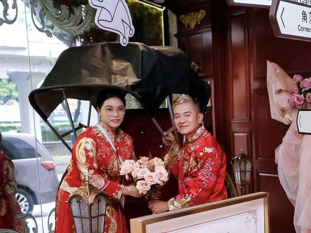 婚照拍摄地点选址在广东胜利宾馆博物馆,馆内陈列的老照片、旧电话、黑胶唱片机等老物件如一把“时光钥匙”,唤起长者们对往昔的记忆。金婚银婚夫妇身着传统中式婚服,共同留下了“执子之手”的画面。