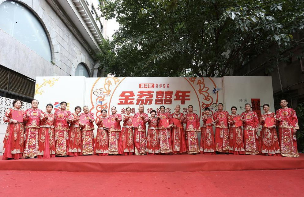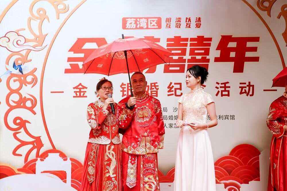 为传承发展中华优秀婚姻家庭文化,持续倡导“相扶相持、互敬互爱”的婚姻家庭经营理念,10月22日,广州市荔湾区民政局在位于沙面岛的广东胜利宾馆举办“金荔囍年”金婚银婚纪念活动,本次活动邀请10对金婚银婚夫妇代表参与。
